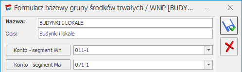 Utworzenie wzorcowych schematów księgowych powoduje dodanie w Konfiguracji Firmy/ Środki trwałe/ Grupy środków trwałych oraz Grupy wartości niematerialnych i prawnych grup o symbolach: