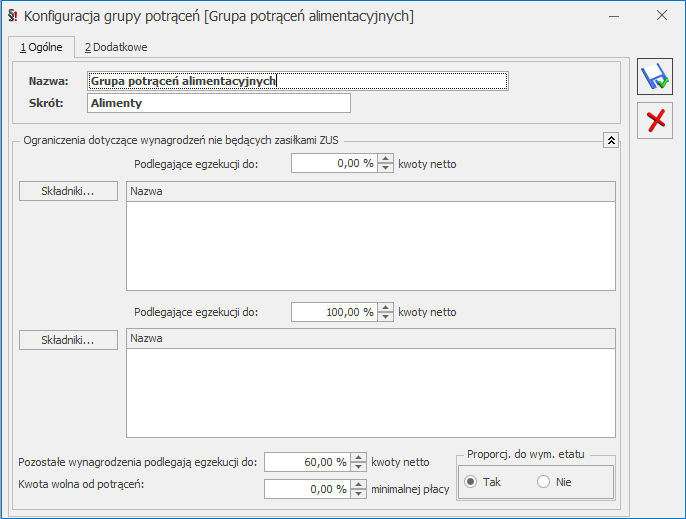 - Podlegające egzekucji do [ ] % kwoty netto (domyślnie podpowiadane jest 0%) – daje możliwość ustawienia odrębnego progu dla II grupy wyjątków.