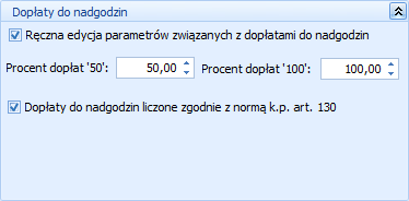 Procent dopłat ‘100’ – określenie procentu dopłat za nadgodziny standardowo naliczanych jako 100%,