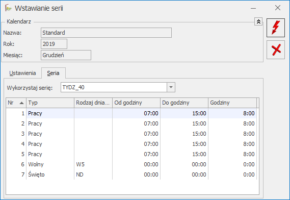 Procedura zalecana – najpierw nanosi się serię, później uzupełnia listę świąt i dni dodatkowo wolnych od pracy, poprzez naciśnięcie ikony