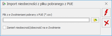 7. Import e – Zwolnień. Wprowadzono możliwość zaimportowania e – zwolnienia na dni, w których jest już wprowadzona inna nieobecność lub obecność. Na oknie importu nieobecności z pliku z pobranego z PUE dodano parametr Zamień nieobecność/obecność na e – Zwolnienie. Działanie parametru: