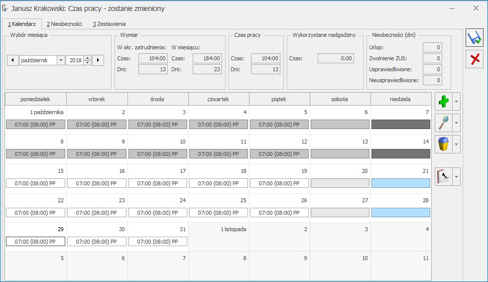 1. Kalendarz pracownika. Wprowadzono zmiany w wyświetlaniu informacji dotyczących wymiaru oraz czasu pracy w planie pracy oraz kalendarzu (Nie)obecności w przypadku zatrudnienia/zwolnienia pracownika w trakcie miesiąca. W miesiącu zatrudnienia/zwolnienia pracownika w trakcie miesiąca została dodana informacja o wymiarze przypadającym w okresie zatrudnienia. Czas pracy w dniach i godzinach jest zawężony do okresu zatrudnienia. Dodatkowo dni przypadające poza okresem zatrudnienia zostały wyraźnie oznaczone: