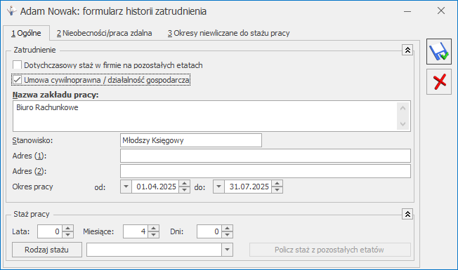 Podczas naliczania stażu na potrzeby ustalania limitu nieobecności czy dodatków stażowych uwzględniane będą umowy cywilnoprawne, które były wykonywane w danej firmie i mają zaznaczony parametr Uwzględniaj okres umowy do stażu pracy lub okresy wprowadzone w historii zatrudnienia, które mają zaznaczony parametr Umowa cywilnoprawna/działalność gospodarcza.