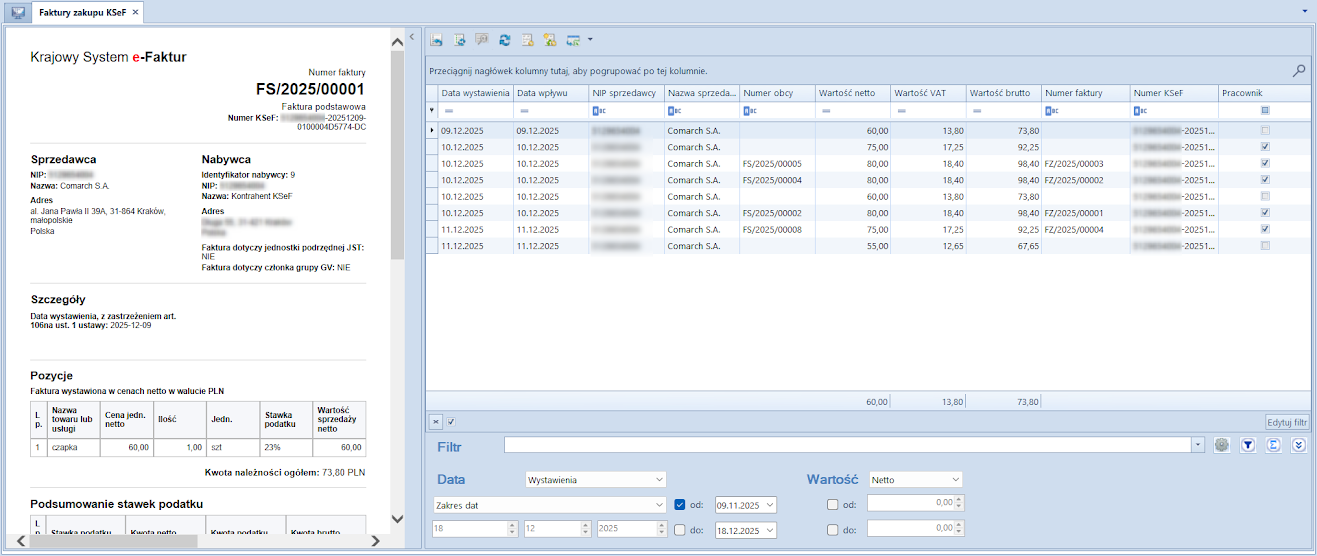 Widok listy Faktury zakupu KSeF
