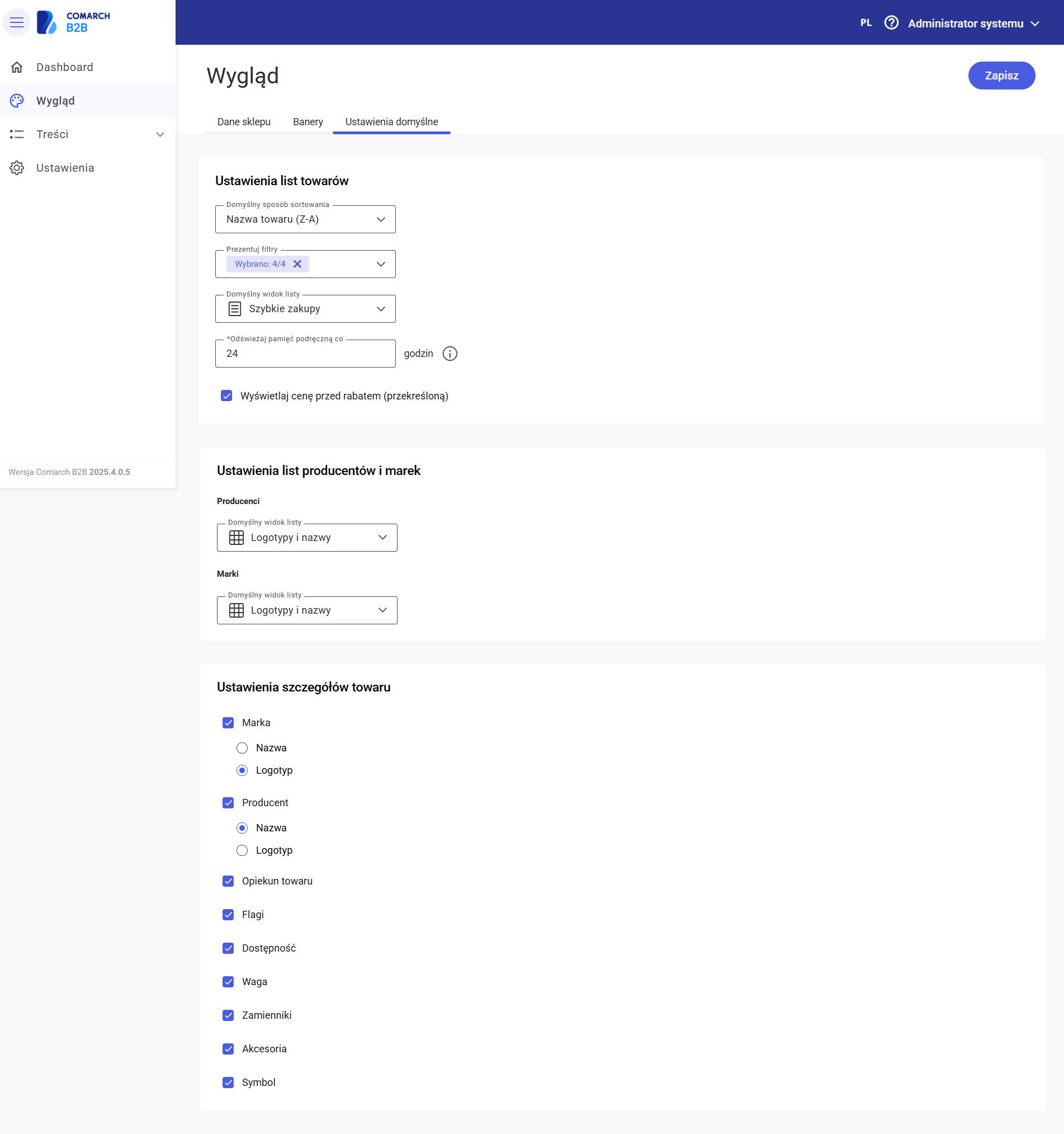 Sekcja Wygląd/ Ustawienia domyślne służy do zarządzania różnego rodzaju ustawieniami domyślnymi dotyczącymi interfejsu Comarch B2B.