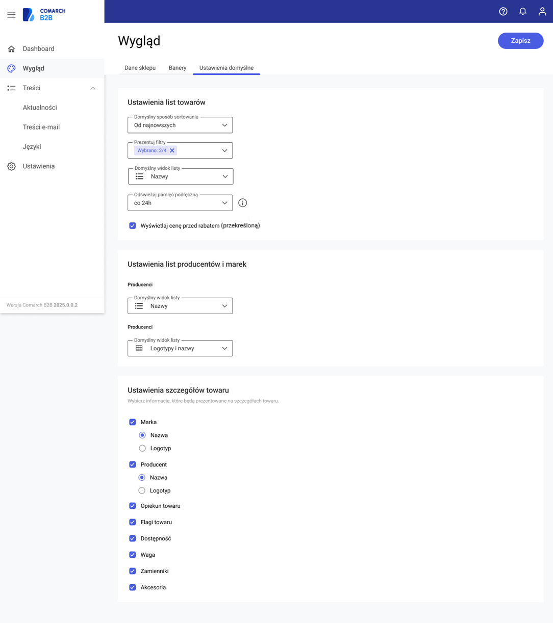 Sekcja Wygląd/ Ustawienia domyślne służy do zarządzania różnego rodzaju ustawieniami domyślnymi dotyczącymi interfejsu Comarch B2B.