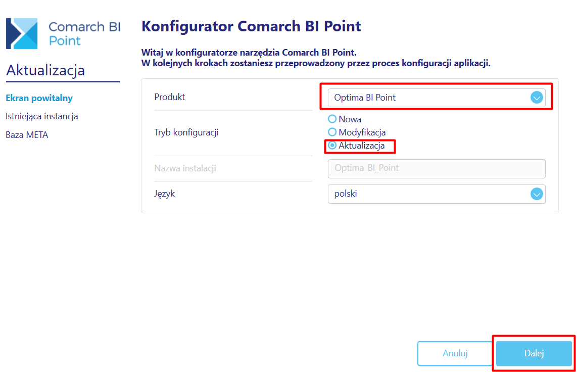 Po uruchomieniu konfiguratora należy wybrać produkt, zaznaczyć opcję „Aktualizacja” oraz kliknąć przycisk „Dalej”.