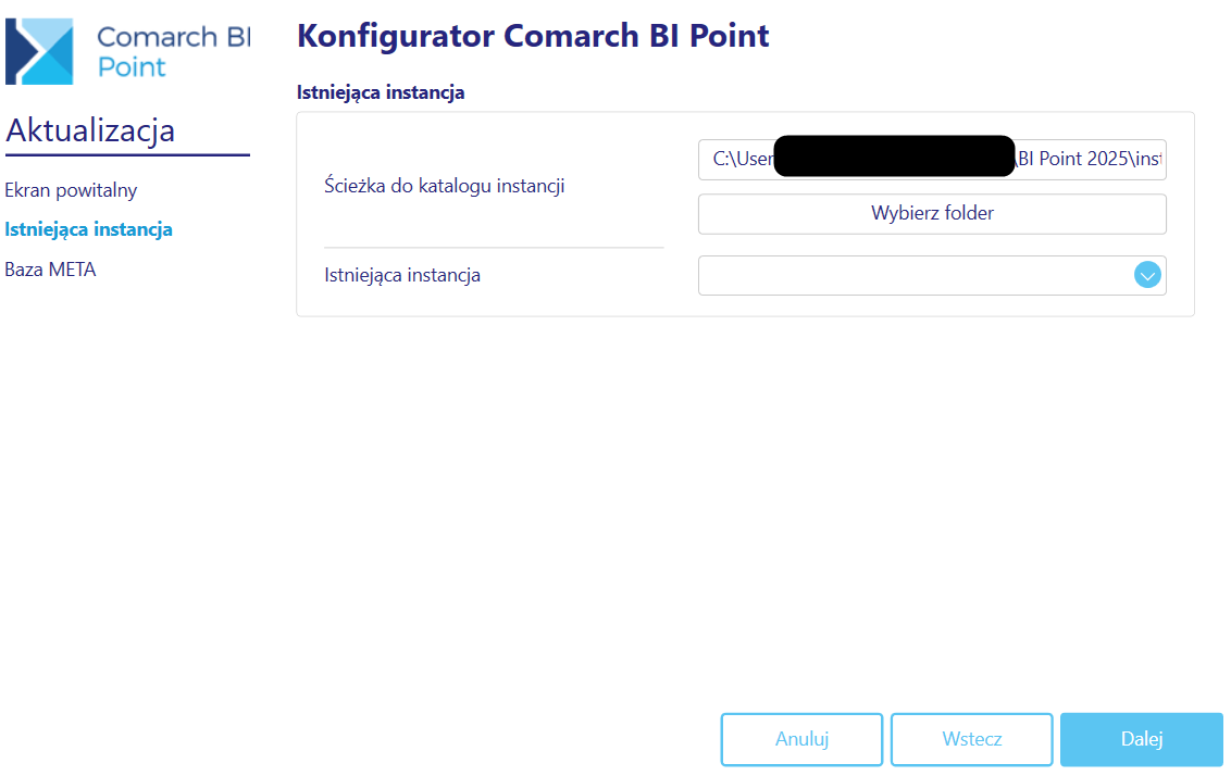 W dalszej części procesu należy wskazać pliki instancji aktualnie zainstalowanego programu BI Point. Domyślnie system sugeruje ścieżkę do plików instancji na podstawie lokalizacji konfiguratora. W przypadku, gdy konfigurator znajduje się w innej lokalizacji niż docelowe pliki instancji, istnieje możliwość ręcznego wskazania katalogu z instancją, która zostanie poddana migracji.