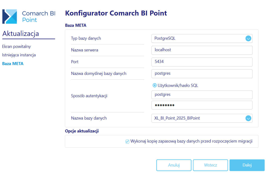Na kolejnym etapie należy zweryfikować poprawność danych, wybrać bazę danych BI Point, a następnie przejść do dalszej części procesu.