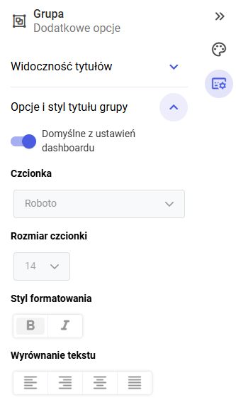 1. Domyślne z ustawień dashboardu po jej włączeniu grupa dziedziczy styl tytułu z globalnych ustawień dashboardu. Po wyłączeniu możliwe jest ręczne definiowanie stylu.