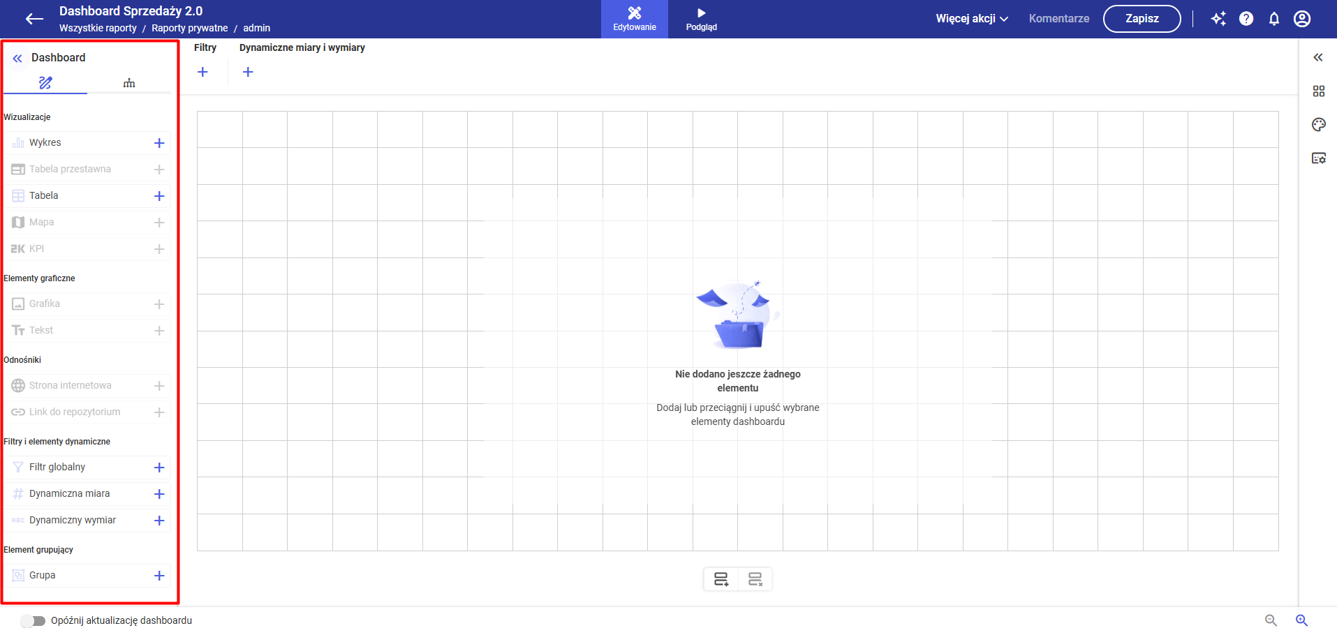 Panel pełni funkcję głównego miejsca wyboru komponentów dashboardu i umożliwia szybkie budowanie układu raportu bez konieczności korzystania z dodatkowych menu. Elementy dostępne w panelu są pogrupowane tematycznie, co ułatwia nawigację i organizację pracy.