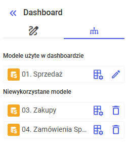 umożliwiająca zarządzanie źródłami danych wykorzystywanymi na dashboardzie. Sekcja ta prezentuje podział na: Modele użyte w dashboardzie – modele aktualnie wykorzystywane przez co najmniej jedną kontrolkę, Niewykorzystane modele – modele dodane do dashboardu, które nie są obecnie przypisane do żadnego elementu.