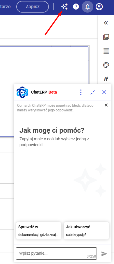 Wybór tej ikony spowoduje uruchomienie ChataERP na dashboardach.