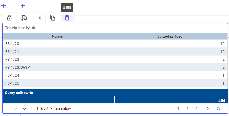 Otwiera prawy panel formatowania tabeli, w którym dostępne są szczegółowe ustawienia wyglądu, kolorów, sum oraz stylu danych.