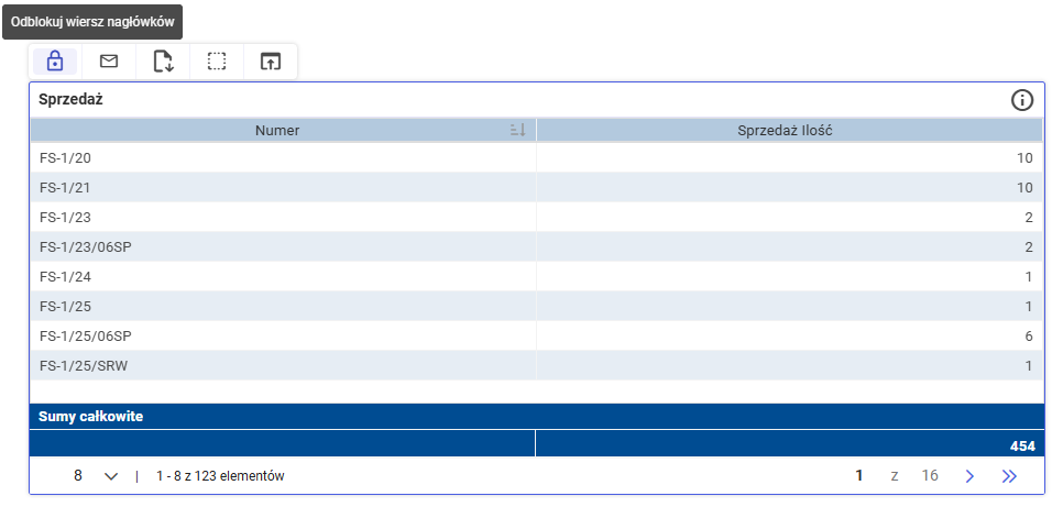 Pozwala zablokować nagłówek tabeli, aby pozostawał widoczny podczas przewijania danych, lub odblokować go w celu edycji.