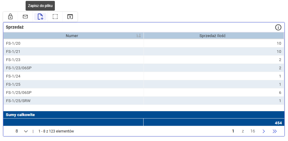 Eksportuje dane tabeli do pliku (np. Excel / CSV / PDF).