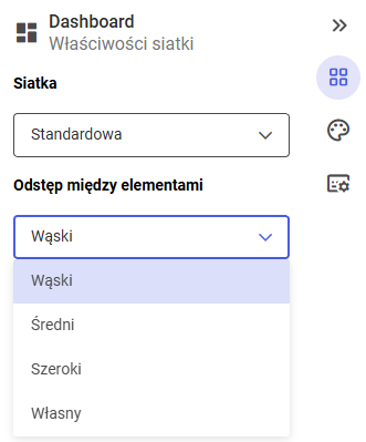 Sekcja Właściwości siatki odpowiada za układ przestrzenny elementów dashboardu.
