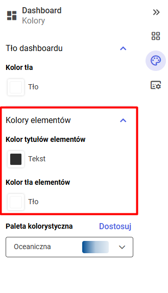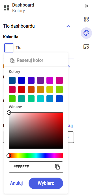Sekcja Kolory umożliwia dostosowanie globalnej kolorystyki dashboardu.
