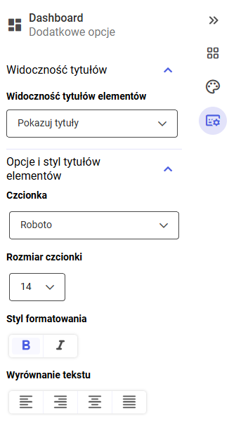 - Opcje i styl tytułów elementów umożliwiają globalne zarządzanie wyglądem nagłówków wszystkich kontrolek znajdujących się na dashboardzie. Ustawienia w tej sekcji wpływają na elementy korzystające z domyślnych właściwości tytułów. Dostępne opcje obejmują: