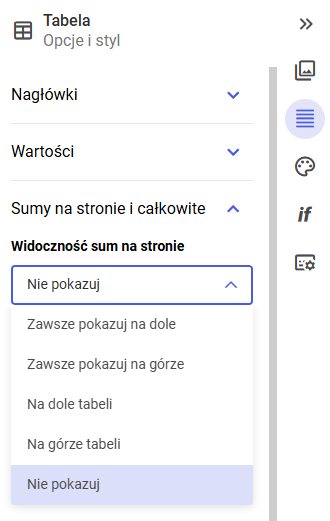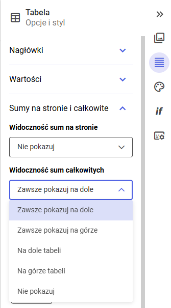 Odpowiada za wyświetlanie sum obejmujących wszystkie dane w tabeli, niezależnie od paginacji. Dostępne opcje: zawsze pokazuj na dole – sumy całkowite widoczne na dole tabeli, zawsze pokazuj na górze – sumy całkowite widoczne na górze tabeli, na dole tabeli – sumy prezentowane na końcu danych, na górze tabeli – sumy prezentowane na początku danych, nie pokazuj – sumy całkowite są ukryte.