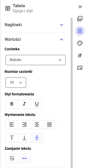 Analogiczne ustawienia jak dla nagłówków, lecz dotyczą komórek danych w tabeli.