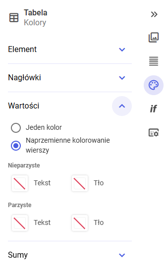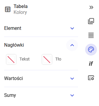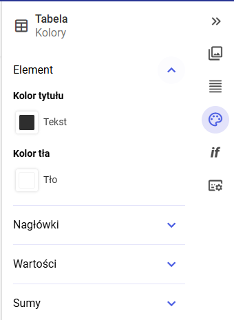 Sekcja Kolory odpowiada za warstwę wizualną tabeli.