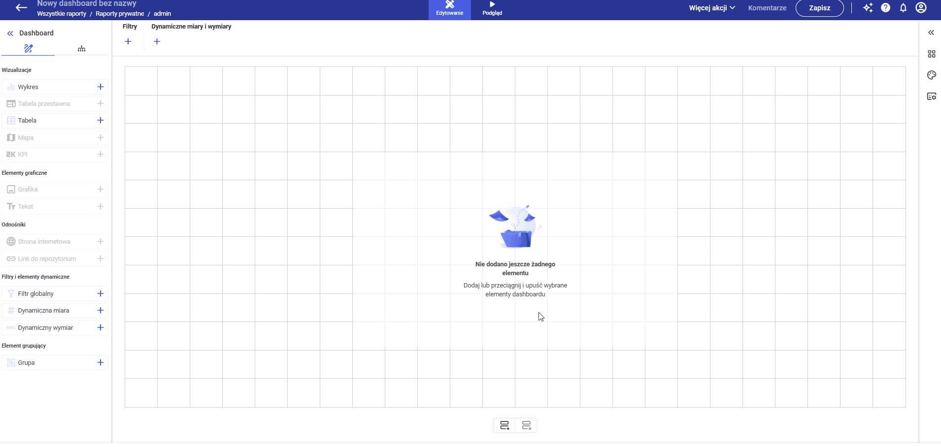 Dodawanie kontrolki tabeli odbywa się w trybie edycji dashboardu poprzez wybór opcji dodania nowej kontrolki i wskazanie typu Tabela. Element można dodać za pomocą przycisku „+” lub metodą drag & drop z panelu dostępnych kontrolek na obszar dashboardu.