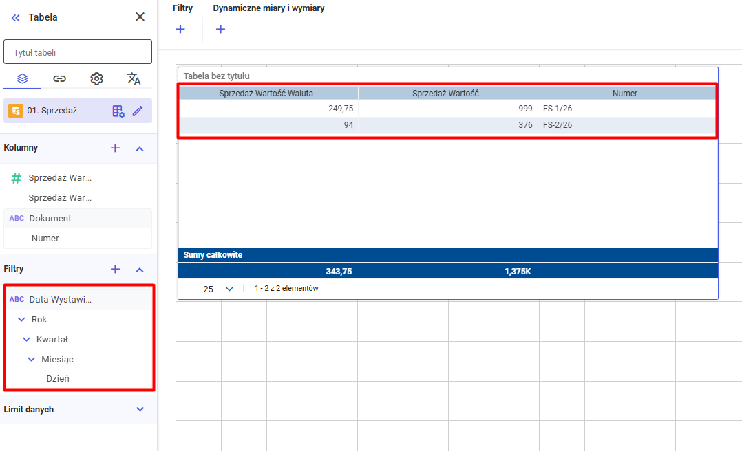 Pole Filtry działa analogicznie do filtrowania wymiaru dodanego w sekcji Kolumny, jednak zastosowane wartości nie są prezentowane bezpośrednio w tabeli. Filtr funkcjonuje w tle i wpływa wyłącznie na zakres danych zwracanych do kontrolki, bez dodawania dodatkowej kolumny ani wizualnej reprezentacji wybranego wymiaru w widoku tabeli.