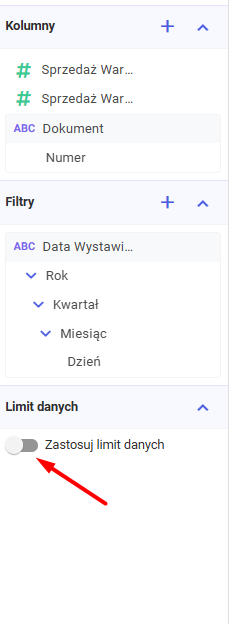 Po jej włączeniu dostępne stają się dodatkowe ustawienia: Liczba elementów – określa maksymalną liczbę wierszy, które zostaną zwrócone do tabeli. Wyświetlaj elementy – definiuje sposób wyboru danych objętych limitem (np. wartości domyślne lub inne dostępne tryby prezentacji). Sortuj według – wskazuje miarę lub kolumnę, na podstawie której system wybiera rekordy objęte limitem.