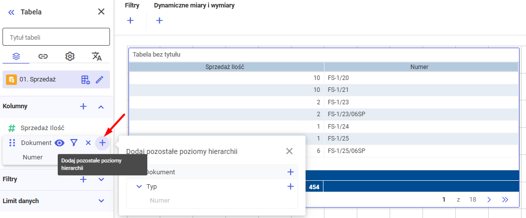 W przypadku dodania wymiarów posiadających hierarchię istnieje możliwość zarządzania jej poziomami. Użytkownik może usuwać poszczególne elementy hierarchii z osi lub – w sytuacji dodania jednego z poziomów – rozszerzyć ją o kolejne poziomy poprzez wybranie opcji „Dodaj pozostałe poziomy hierarchii”. Funkcjonalność ta pozwala na szybkie budowanie pełnej struktury podziału danych bez konieczności ręcznego dodawania każdego poziomu oddzielnie.