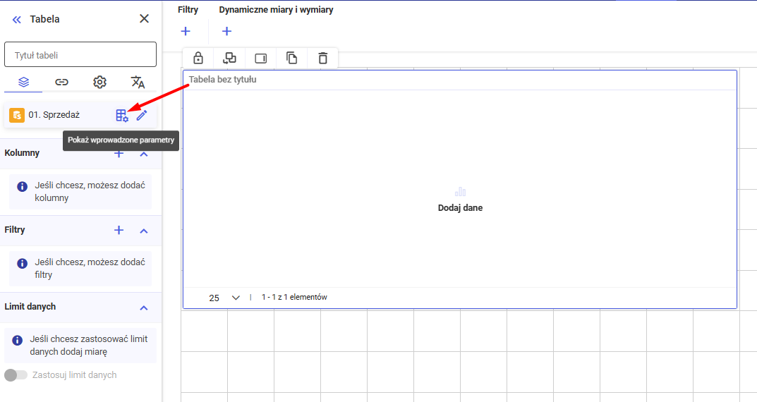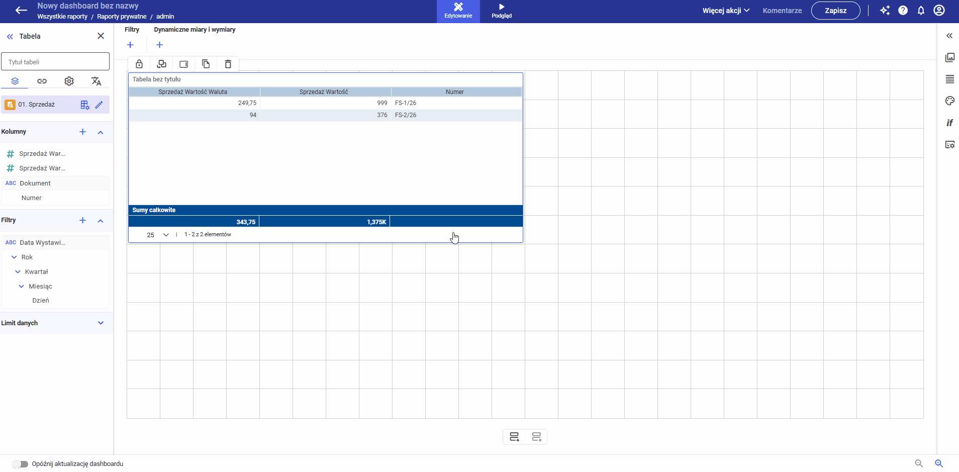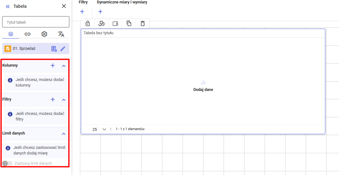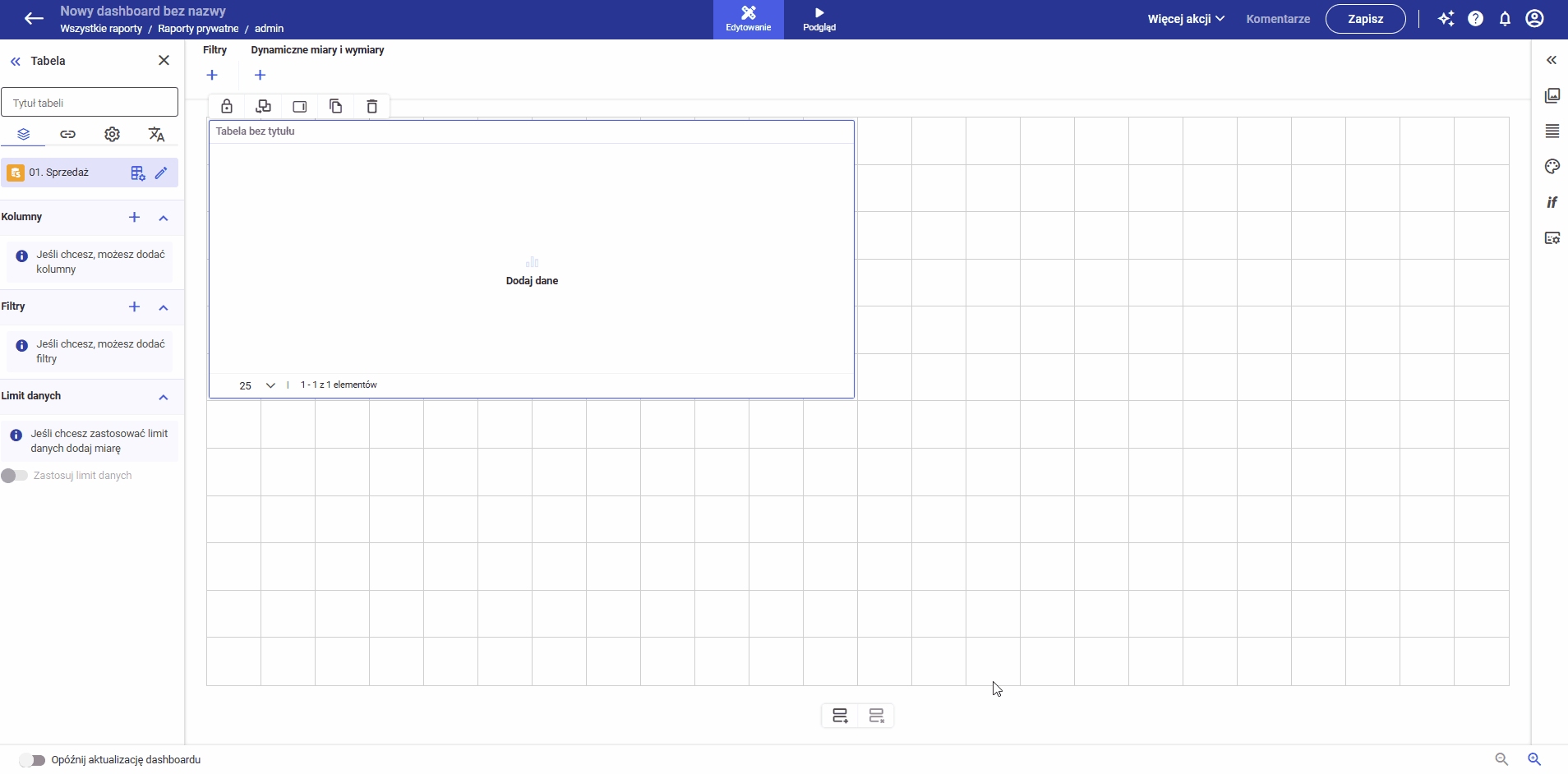 Edytor danych tabeli służy do konfiguracji elementów danych wyświetlanych w kontrolce. W tej sekcji użytkownik może definiować kolumny, miary i wymiary oraz dodawać filtry wpływające na zakres prezentowanych informacji. Panel umożliwia również ustawienie limitu danych. Wprowadzane zmiany mają bezpośredni wpływ na zawartość i strukturę danych renderowanych w kontrolce.