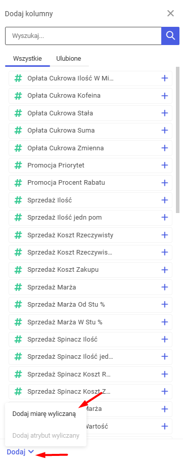 Dodatkowo w sekcji Kolumny istnieje możliwość utworzenia miary wyliczanej poprzez wybranie opcji „Dodaj” → „Dodaj miarę wyliczaną”. Funkcjonalność ta pozwala na zdefiniowanie własnych obliczeń na danych i wykorzystanie ich jako osobnej kolumny w tabeli.