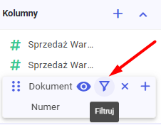 Sekcja Kolumny umożliwia dodawanie oraz konfigurację elementów wyświetlanych w tabeli. Użytkownik może wskazać miary i wymiary, które mają zostać zaprezentowane w formie kolumn, a także zmieniać ich kolejność oraz usuwać je z widoku.