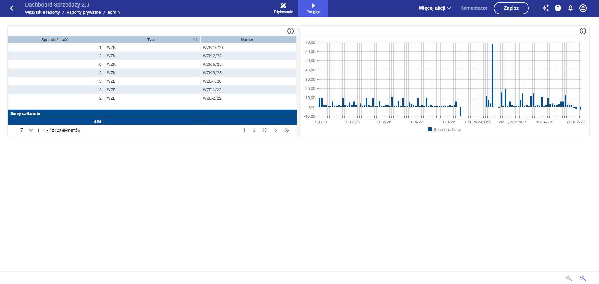 W trybie podglądu użytkownik może korzystać z funkcji kontekstowych poszczególnych kontrolek, np. sortować dane na wykresach i tabelach lub filtrować informacje za pomocą dodanych filtrów globalnych. Dostępne możliwości zależą od tego, jakie elementy znajdują się na dashboardzie – inne opcje pojawią się przy wykresie, inne przy tabeli, a jeszcze inne przy filtrze.