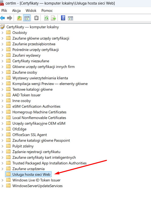 W takim przypadku skonfigurowane muszą zostać dwa endpointy, jeden dla http i drugi dla https (port 443). Aby https działa poprawnie, konieczne jest zdefiniowanie certyfikatu, który będzie wykorzystywany w komunikacji. Dla systemu windows najłatwiej wyszukać jego ścieżkę z użyciem narzędzia MMC (Microsoft Management Console). W przypadku, jeśli certyfikat nie jest zaimportowany, powinien znaleźć się w gałęzi WebHosting.