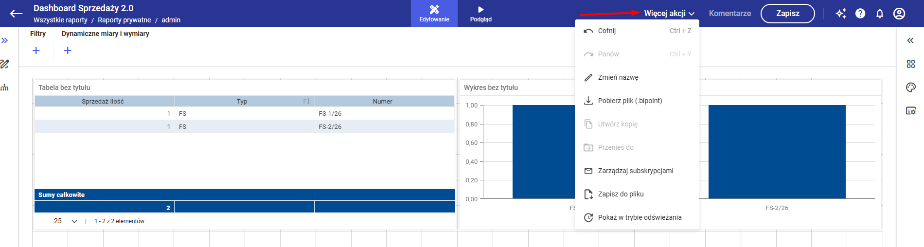 Opcja „Więcej akcji” znajduje się w górnym pasku dashboardu i zawiera dodatkowe operacje administracyjne oraz zarządcze dotyczące całego dashboardu, a nie pojedynczych kontrolek. Menu to pozwala m.in. na cofanie zmian, zmianę nazwy czy eksport pliku.