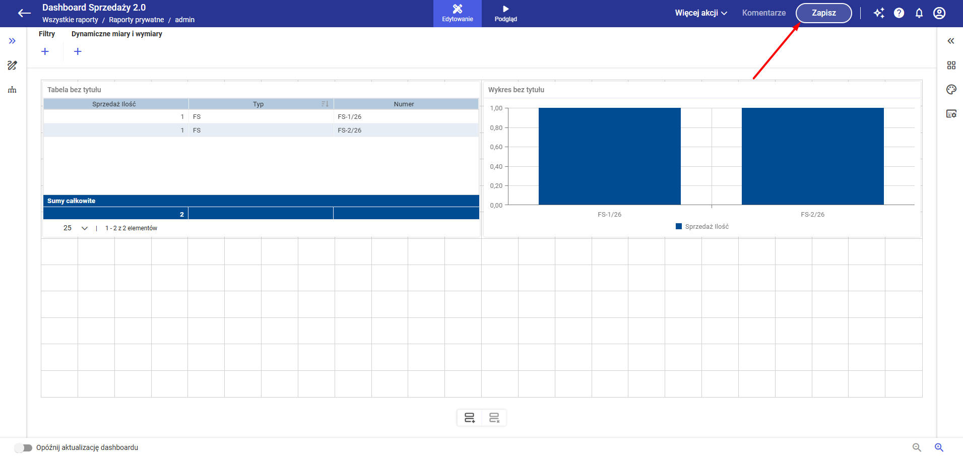 Akcja „Zapisz” pozwala użytkownikowi na zapisanie istniejącego dashboardu.