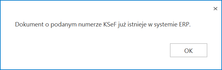Jeśli dokument o podanym numerze KSeF istnieje w Comarch ERP XL, wówczas próba wygenerowania dokumentu zakończy się niepowodzeniem i zostanie wyświetlony komunikat: „Dokument o podanym numerze KSeF już istnieje w systemie ERP”.