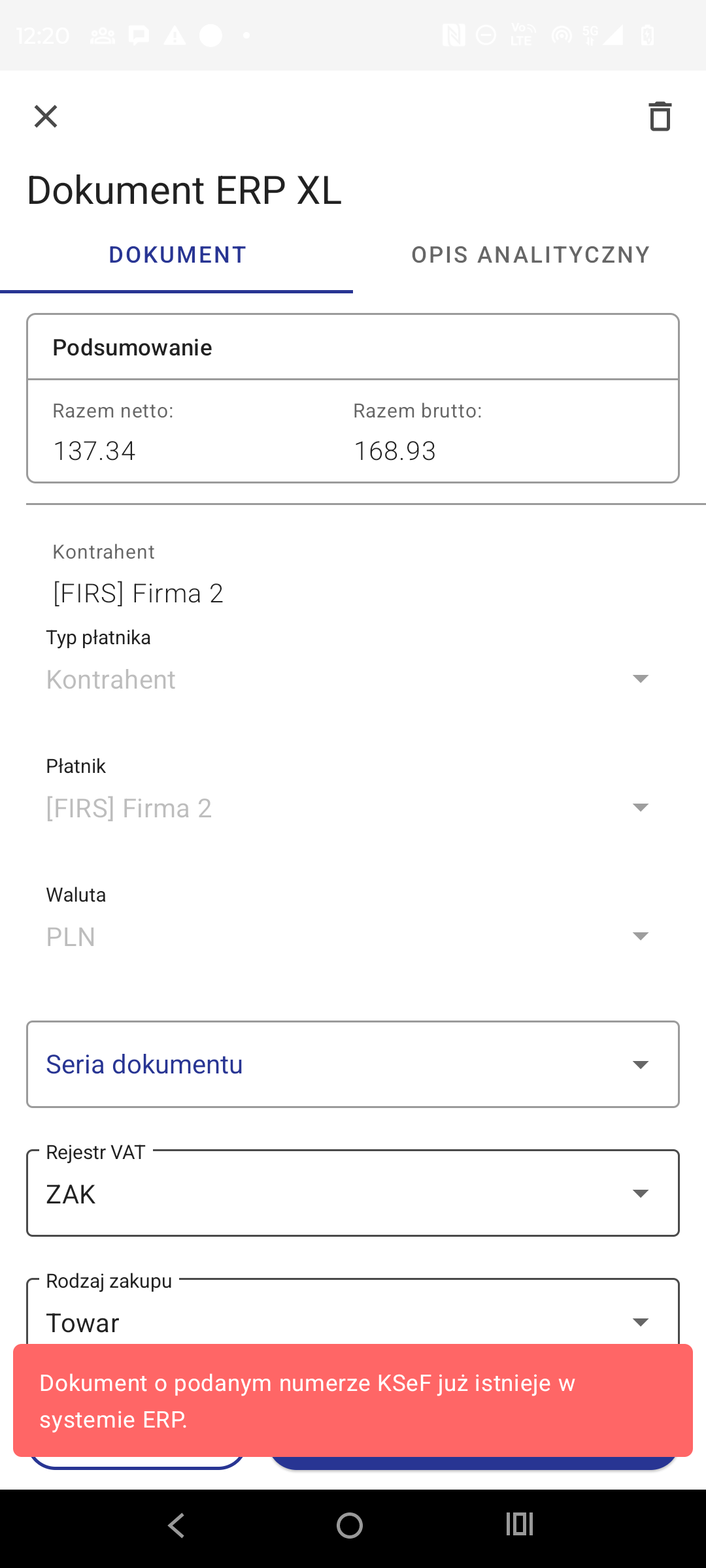 W wersji 2026.0.0 wprowadzono weryfikację istnienia dokumentu KSeF w Comarch ERP XL w przypadku, kiedy na zakładce „Dokument” znajdującej się na formatce „Dokument ERP XL” w kontrolce typu Dokument ERP XL w ramach kontrolki „Numer KSeF” wprowadzono numer faktury KSeF, a następnie operator kliknął w przycisk [Generuj dokument] (desktop)/ [Generuj dokument] (web)/ [Generuj dokument] (Android)/ [Generuj dokument] (iOS)