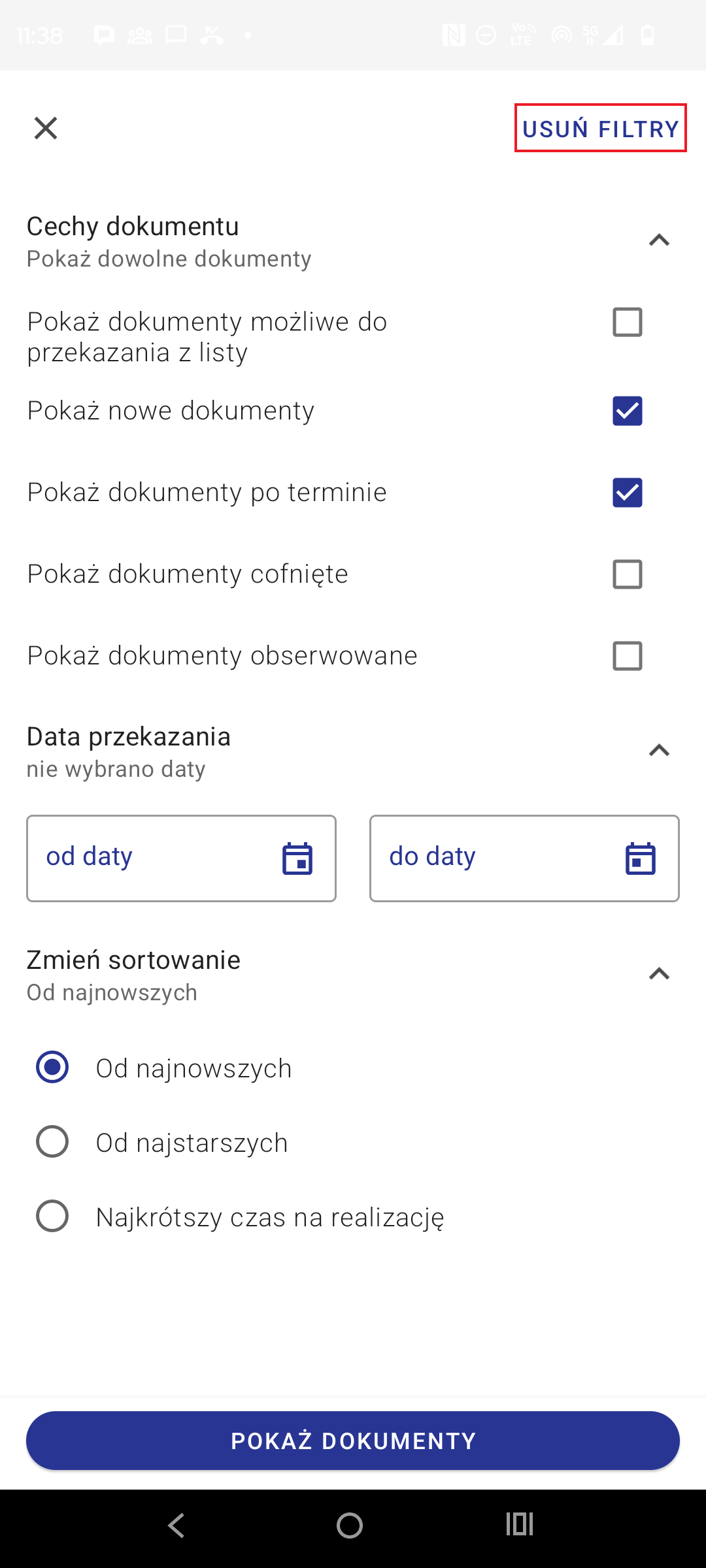 Opcja czyszczenia wszystkich filtrów (także typu lub/oraz rodzaju) dla dokumentów za pomocą jednego przycisku – „Usuń filtry“, tak, aby przywrócone zostały początkowe ustawienia listy dokumentów („U mnie”, „Wszystkie typy”, „Filtry”);