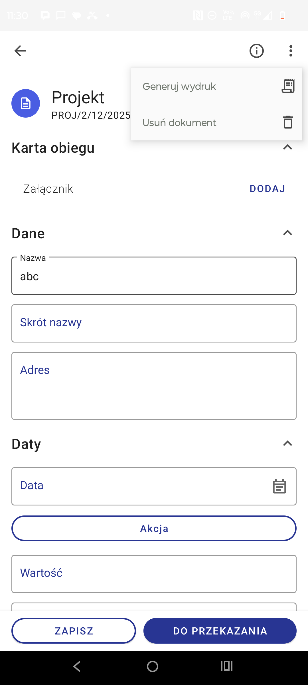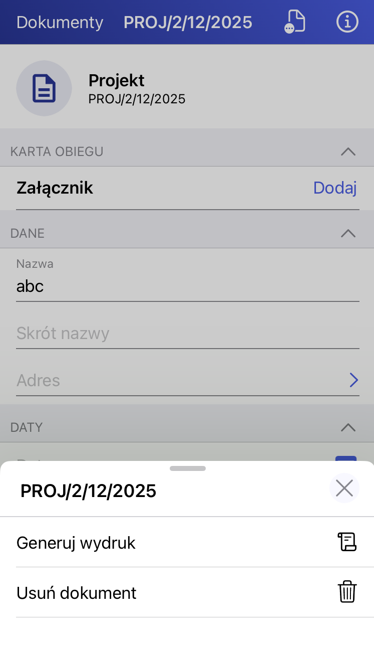 W ramach karty obiegu usunięto ikonę kosza i wprowadzono zamiast niej menu kontekstowe ( dla aplikacji na Android, dla aplikacji na iOS), w którym dostępne są dwie opcje: