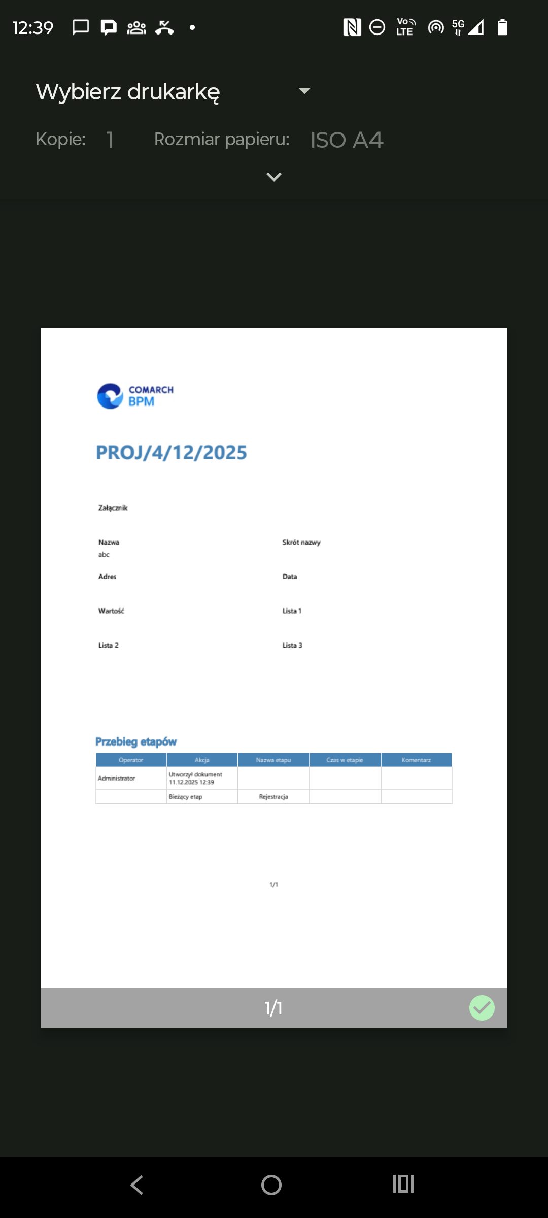 W wersji 2026.0.0 w aplikacjach mobilnych Comarch BPM na systemy: Android i iOS umożliwiono uruchomienie zdefiniowanych wydruków (raportów) z poziomu karty obiegu. Z tego powodu wprowadzono następujące zmiany: