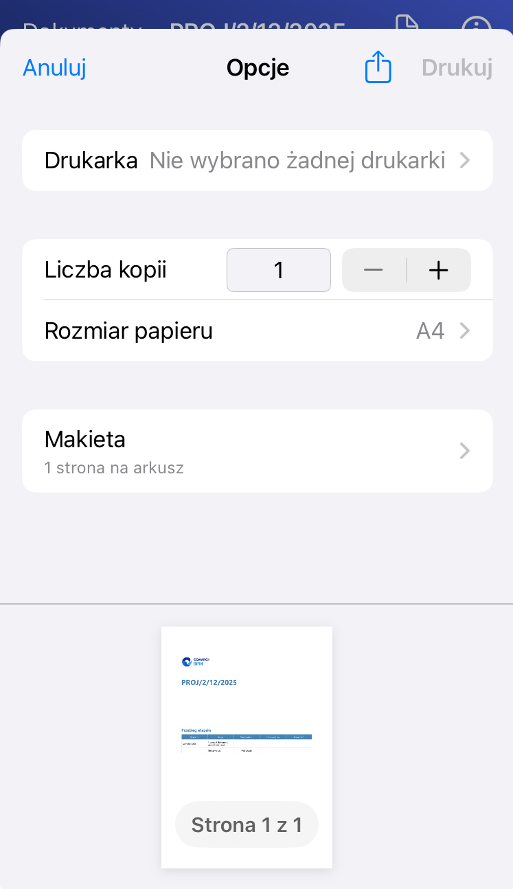 Widok przykładowych szczegółów dokumentu w aplikacji web – na liście dostępnej po kliknięciu w opcję „Wygeneruj raport” widoczny jest wydruk sPrint