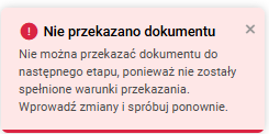 wówczas jeśli określone warunki przekazania nie zostały spełnione, a w aplikacji web operator podejmuje próbę przekazania dokumentu z listy, wyświetlony zostaje następujący komunikat: Nie przekazano dokumentu.Nie można przekazać dokumentu do następnego etapu, ponieważ nie zostały spełnione warunki przekazania. Wprowadź zmiany i spróbuj ponownie.
