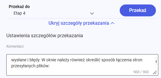 Zarówno w aplikacji web, jak i w Repozytorium zwiększono liczbę znaków, które można wprowadzić w ramach pola „Komentarz”, znajdującego się w panelu szczegółów przekazania – z 255 znaków do 900 znaków. Tak jak dotychczas operator może rozciągnąć pole komentarza, chwytając w prawym dolnym rogu i rozciągając je. Jeżeli ilość znaków przekracza dostępne miejsce w polu komentarza, wówczas zostanie wyświetlony suwak.