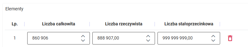 Widok przykładowych wartości w kolumnach liczbowych w kontrolce typu Dane tabelaryczne
