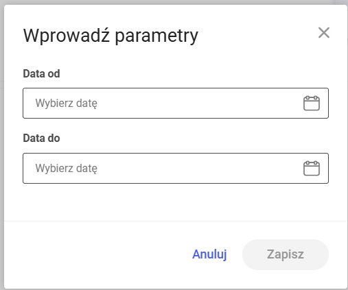 Jeżeli dany wydruk sPrint wymaga podania parametrów do wywołania wydruku, wówczas po kliknięciu w nazwę wydruku w aplikacji web na zakładce [Raporty] albo z poziomu listy dokumentów zostanie wyświetlone okno, w którym operator może wprowadzić parametry. W przypadku konieczności podania jako parametru numeru dokumentu, gdy wydruk sPrint jest wywoływany z poziomu szczegółów dokumentu, parametr jest automatycznie uzupełniany, a okno do wprowadzania parametrów nie zostaje wywołane. W ramach okna do wprowadzania parametrów dostępne są następujące przyciski: