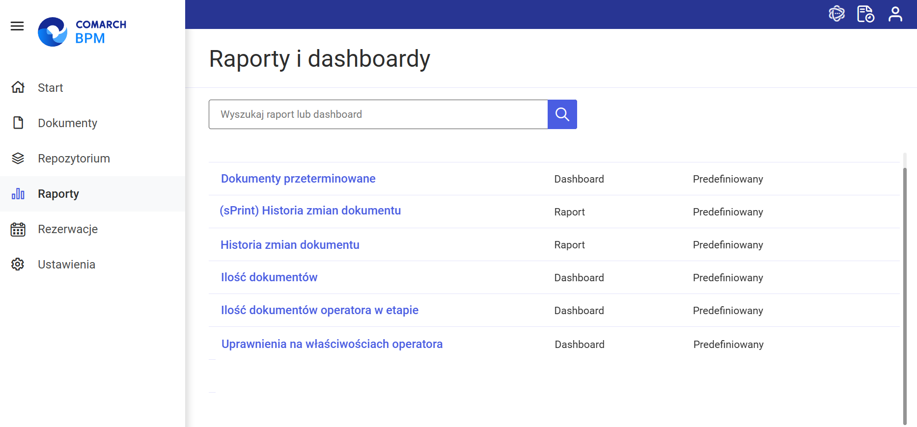 Od wersji 2026.0.0 w przypadku, jeśli w aplikacji desktop Comarch BPM w ramach zakładki [Kreator raportów i dashboardów] w zakładce „Uprawnienia” nadano danemu operatorowi prawo do pracy z danymi wydrukami sPrint, wówczas te wydruki sPrint są dostępne w aplikacji web Comarch BPM w zakładce [Raporty].