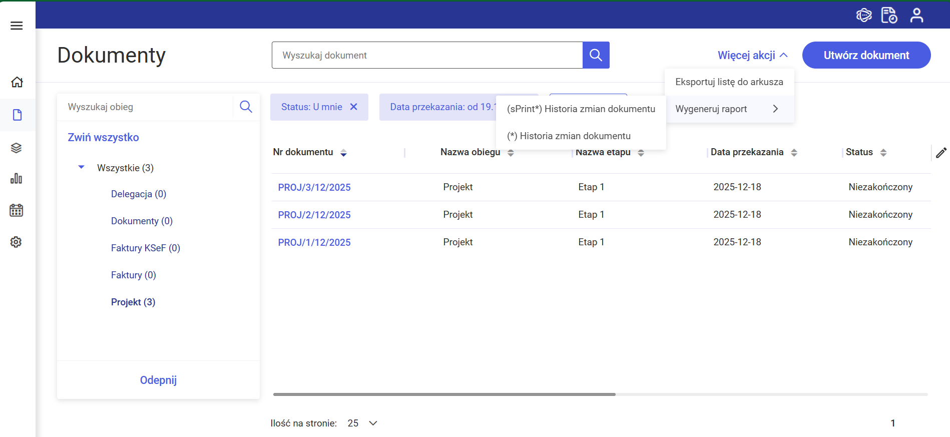 Widok przykładowej listy dokumentów w aplikacji web – na liście dostępnej po kliknięciu w opcję „Wygeneruj raport” widoczny jest wydruk sPrint