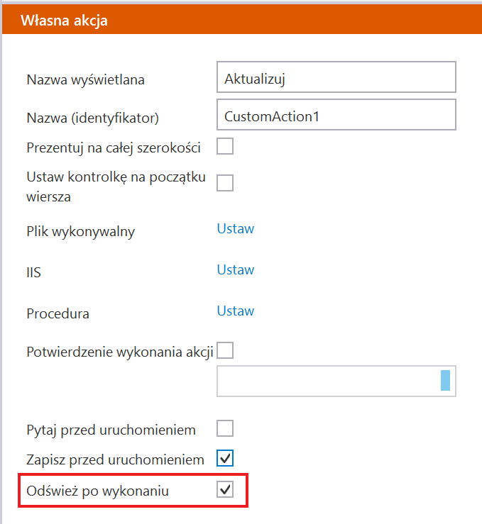 Za pomocą funkcjonalności „Odśwież po wykonaniu” można np. zaktualizować wartości kontrolek, które zostały zainicjowane uruchomieniem własnej akcji.